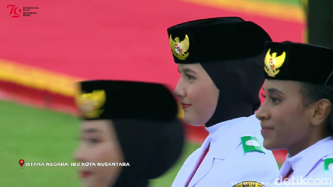 Denpasar - Upacara peringatan detik-detik proklamasi di Ibu Kota Negara (IKN) Jakarta telah dimulai. Sempat menjadi polemik, paskibraka putri tampak ada yang mengenakan jilbab di dalam barisan.