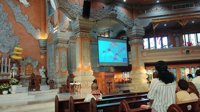 Misa akbar bersama Pemimpin Tertinggi Gereja Katolik Dunia, Paus Fransiskus, tidak hanya dihadiri para jemaat di Gelora Bung Karno, Jakarta. Semua umat Katolik se-Indonesia, termasuk di Denpasar, Bali, juga menghadiri misa secara daring di gereja.