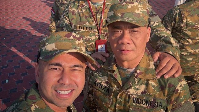 Raffi Ahmad mengunggah momen tersebut di Instagram miliknya. Suami Nagita Slavina itu terlihat memakai seragam Komcad lengkap dengan topi.