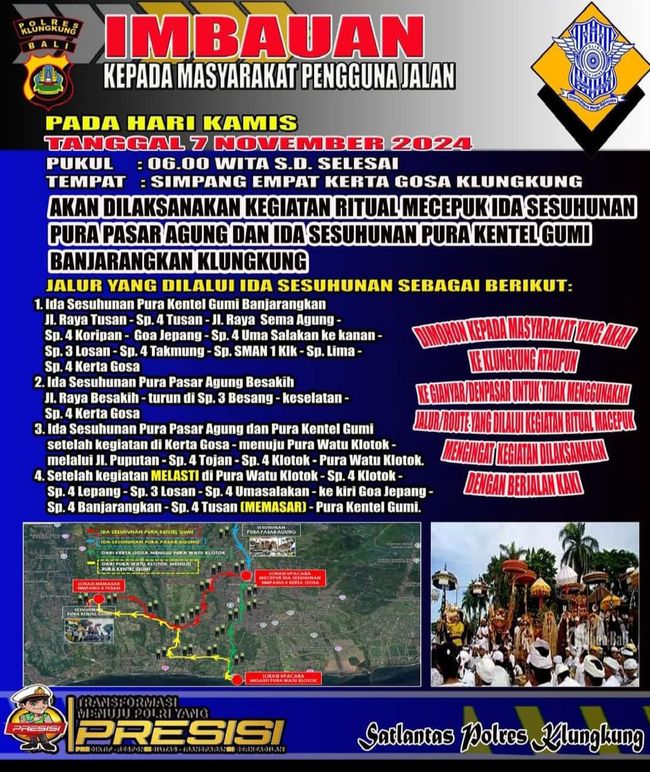 "Permakluman kepada seluruh umat Hindu, masyarakat umum, serta pengguna jalan, pada 7 November 2024, mulai pukul 06.00 Wita, pengendara harap cari alternatif lain," kata Cok Brasika saat dikonfirmasi detikBali, Selasa (5/11/2024).