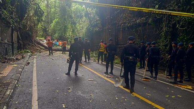 Salah satu titik pohon tumbang bahkan menutupi akses jalan di Campuhan, Ubud, Gianyar. Akibatnya, pengendara dari arah Denpasar tidak bisa melintas karena pohon melintang di tengah jalan.