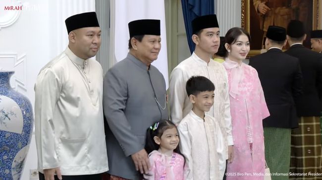 Putri bungsunya, La Lembah Manah, turut mengenakan busana serupa. Sementara itu, Gibran dan putra mereka, Jan Ethes, kompak mengenakan baju koko berwarna coklat pastel.