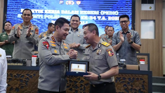 Kepala Kepolisian Daerah (Kapolda) Bali, Irjen Daniel Adityajaya, memimpin paparan hasil Praktik Kerja Dalam Negeri (PKDN) Sekolah Staf dan Pimpinan Tinggi (Sespimti) Pendidikan Reguler (Dikreg) ke-34 Tahun Angkatan (TA) 2025. Paparan dilaksanakan di Rupatama Polda Bali, Jumat (25/04/2025).