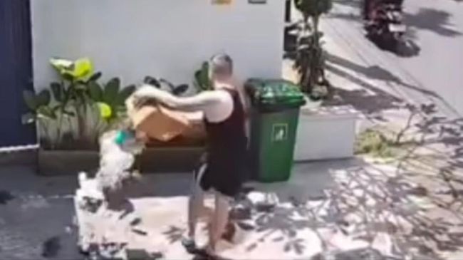 Berdasarkan video yang beredar di medsos, pria asing itu terlihat membuang sampah berwadah kardus ke halaman vila yang berhadapan langsung dengan tempat tinggalnya. Beberapa saat kemudian, sejumlah warga datang. Bule yang memakai kaus hitam itu kemudian menyapu lagi sampah yang dia buang.