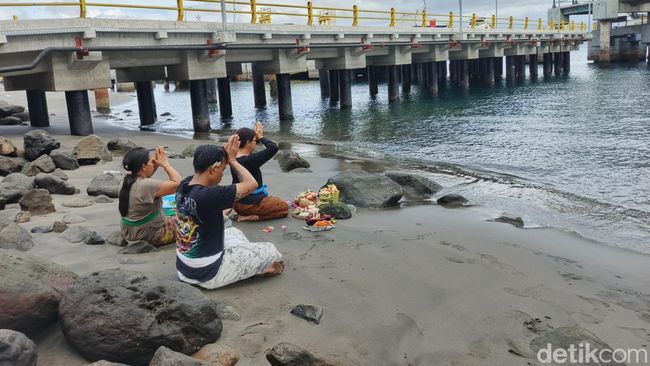 Dari pantauan detikBali, tiga anggota keluarga Surata, meliputi istri, anak, serta seorang pemangku, hadir dalam upacara Nebusin tersebut. Mereka membawa sesajen lengkap dan terlihat melemparkan seekor ayam hitam ke arah laut sebagai bagian dari ritual.