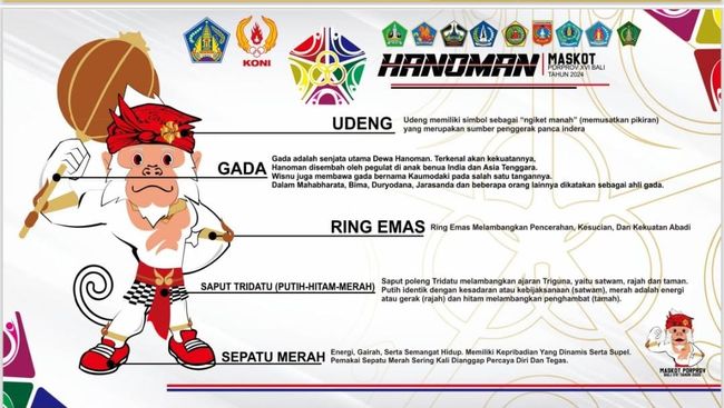 Ketua KONI Bali I Gusti Ngurah Oka Darmawan mengungkapkan maskot Hanoman penuh dengan makna dan filosofi. Hanoman dengan udeng merah memiliki simbol 'ngiket manah' atau memusatkan pikiran. Kemudian, Hanoman juga memegang senjata gada yang terkenal dengan kekuatannya.
