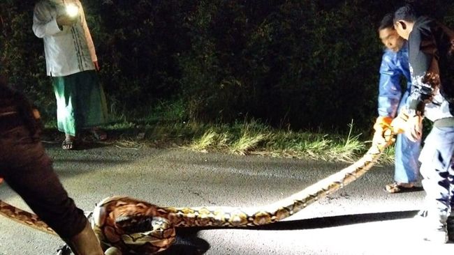 Seekor ular sanca atau piton berukuran raksasa membuat warga Banjar Puana, Desa Tegal Badeng Barat, Kecamatan Negara, Kabupaten Jembrana geger. Ular dengan panjang 5 meter dan berat 33 kilogram (kg) itu melintang di tengah jalan, Selasa (29/7/2025) dini hari.