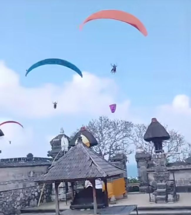 Beberapa waktu lalu beredar sejumlah video aktivitas paralayang melintas di atas Pura, diduga di Pura Gunung Payung, Desa Kutub, Badung, Bali. Hal itu menuai komentar warganet karena dinilai menyalahi radius kawasan suci.