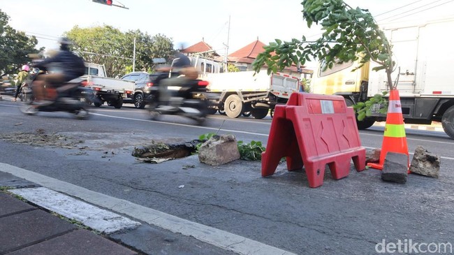 Polisi itu mengatakan penutup saluran air jebol diduga karena terlalu banyak dilintasi kendaraan berat seperti truk. Karenanya, lubang di jalan itu dipasangi pembatas sejak siang hari. Hal itu dibenarkan Kasat Lantas Polresta Denpasar, AKP Yusuf Dwi Admodjo.