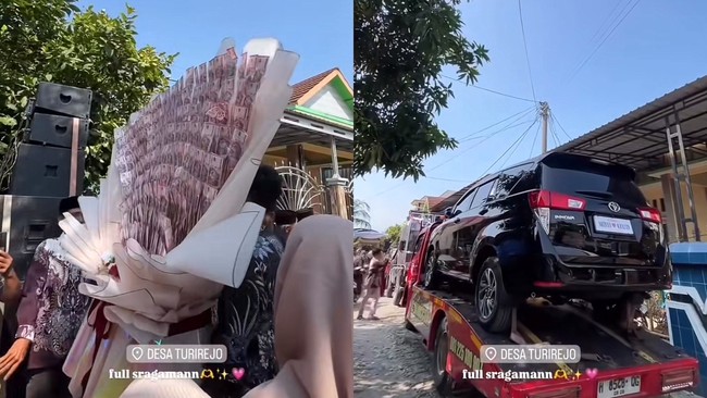 Acara lamaran di Desa Turirejo, Demak, Jawa Tengah (Jateng), viral di media sosial (medsos) setelah video yang menampilkan kemewahan prosesi diunggah ke TikTok. Warganet takjub dengan seserahan yang tak biasa, mulai dari mobil Toyota Innova, perlengkapan rumah tangga dalam jumlah besar hingga buket bunga dari uang tunai.