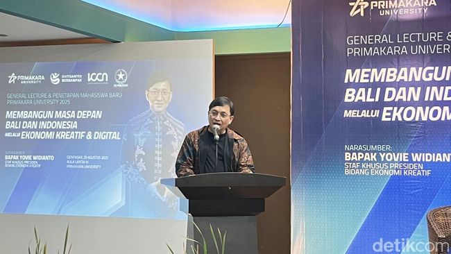 Staf Khusus Kepresidenan Bidang Ekonomi Kreatif Yovie Widianto memberikan motivasi kepada mahasiswa baru Universitas Primakara di Kampus Universitas Primakara, Jumat (29/8/2025). Yovie membahas berbagai hal mulai dari kecerdasan buatan atau Artificial Intelligence (AI) hingga alasan lagu-lagu Kahitna masih populer di kalangan generasi muda.