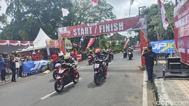 Balapan digelar di sirkuit nonpermanen Jalan Surapati, tepatnya di depan kantor bupati Jembrana, Minggu (14/9/2025). Medali emas disumbangkan pembalap muda andalan Jembrana, Kadek Krisna Darma Putra, di kelas perorangan modifikasi 150 cc.