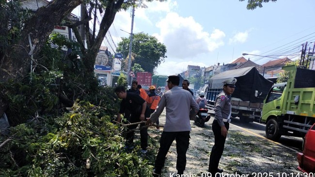 Sebuah dahan pohon perindang yang cukup besar di Bypass Ir. Soekarno, tepatnya di depan RS Puri Bunda, Kecamatan Kediri, Tabanan, patah akibat dihantam truk tronton, Kamis (9/10/2025). Akibatnya, cabang pohon jatuh ke jalan raya dan menimpa pesepeda motor yang kebetulan melintas.