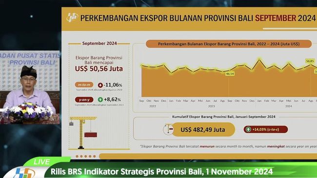 "Kalau kita lihat ekpsor barang di Bali secara month to month mengalami penurunan. Tapi meningkat secara year on year," ujar Wirawan dalam rllis secara daring di kanal YouTube BPS Bali, Jumat (1/11/2024).