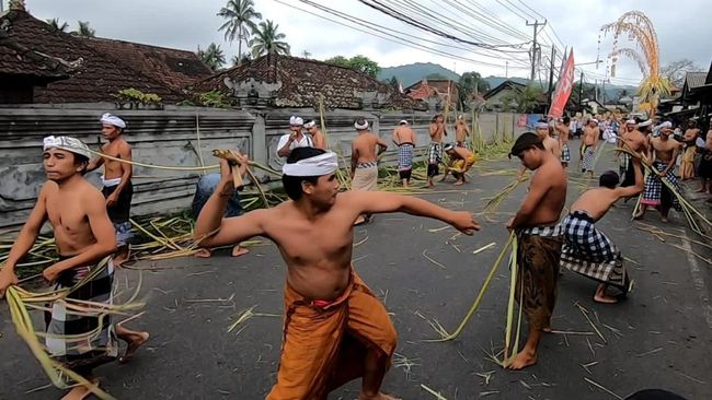 Desa Adat Bebandem, Kecamatan Bebandem, Kabupaten Karangasem, Bali, kembali melaksanakan tradisi metigtig, Selasa (15/11/2022). Saat metigtig berlangsung, para lelaki di desa itu saling serang menggunakan pelepah pisang.