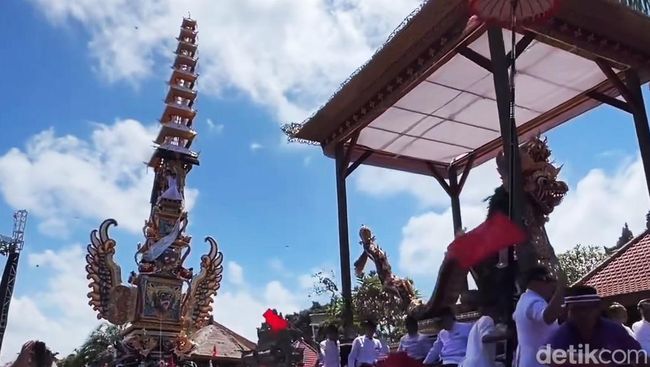 Upacara pelebon atau ngaben (kremasi) di Puri Agung Ubud untuk almarhum Tjokorda Bagus Santaka digelar pada Minggu (14/4/2024). Ritual menggunakan tiga sarana utama, salah satunya bade tumpang sembilan setinggi 25 meter.