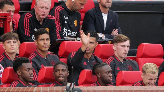Denpasar - Begini ekspresi Cristiano Ronaldo saat Manchester United berlaga melawan Brighton. CR7 menjadi salah satu pemain cadangan MU ketika menjamu Brighton