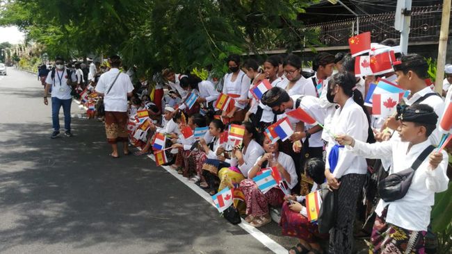 Badung - Ratusan siswa SMP menyambut delegasi KTT G20. Mereka berpakaian adat Bali dan memegang bendera negara di sekitar Bandara Ngurah Rai Bali, Senin (14/11/2022).
