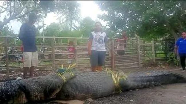 Kupang - Kemunculan seekor buaya muara gegerkan warga Desa Soliu, Kecamatan Amfoang Barat Laut, Kabupaten Kupang, NTT. Buaya berukuran raksasa berhasil ditangkap warga.