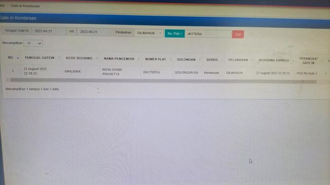 Dari foto yang diterima, tercatat kendaraan dengan nomor polisi DK 1792 FAL masuk Pelabuhan Gilimanuk. Tanggal gate in 21 Agustus 2022 pukul 22.19 Wita. Kode pesanan tiket nomor 00HL93KK, golongan IVA. Kendaraan tercatat dengan pengemudi inisial NSP masuk dari pintu masuk mobil pos R4 Gate 1.