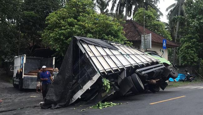 Kelian Banjar Dinas Pengalon I Made Widia mengatakan truk tergelincir diduga karena mengalami patah as akibat beban muatan berlebihan. Truktergelincir ke arah kiri hingga hampir terguling.