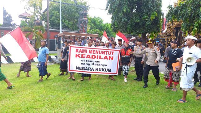 Dari pantauan detikBali, warga datang membawa sejumlah spanduk yang berisi bermacam tuntutan. Salah satunya bertuliskan "teroris saja bisa ditangkap bagaimana dengan kasus vandalisme di tempat suci kami?".
