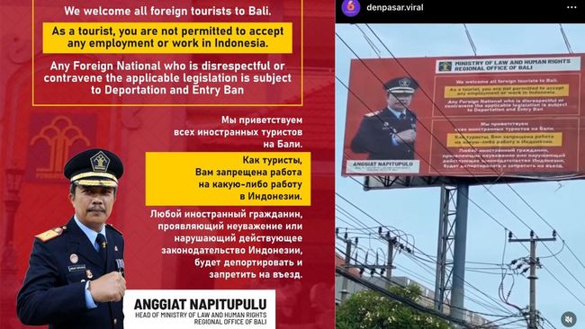 Baliho tersebut bertuliskan: "We welcome all foreign tourists to Bali. As a tourist, you are not permitted to accept any employment or work in Indonesia. Any Foreign National who is disrespectful or contravene the applicable legislation is subject to Deportation and Entry Ban."