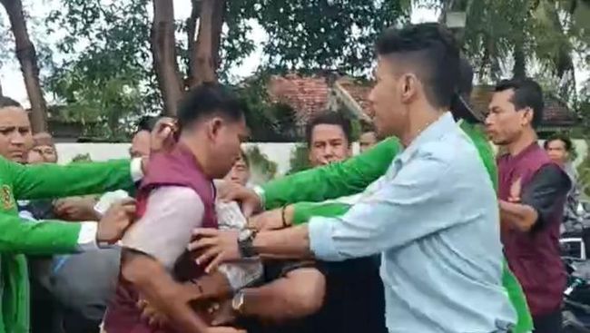 Sementara, sejumlah orang lainnya yang mengenakan seragam hitam putih dan almamater hijau berupaya melerai. Mereka adalah rekan Bayu sesama mahasiswa.