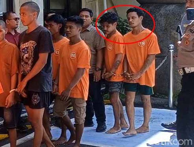 Polisi merilis pelaku kasus pengeroyokan itu bersama sejumlah tersangka kasus kriminal lainnya di Mapolres Badung, Selasa (27/2/2024). Eliezer dan Ardianto berbaris paling belakang saat digelandang dari ruang tahanan.