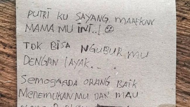 "Putri ku sayang maafkan mama mu ini, tidak bisa nguburmu dengan layak. Semoga ada orang baik menenukanmu dan mau menguburkan."
