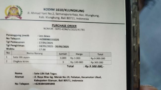 "Sebanyak 1.000 tusuk sate dikirimkan ke Kodim 1610/Klungkung sekitar pukul 17.10 Wita," ujar Komandan Batalion (Danyon) Unit Intel Kodim 1610/Klungkung Letda Inf Gede Sukarsana saat dikonfirmasi detikBali, Selasa (20/5/2025).