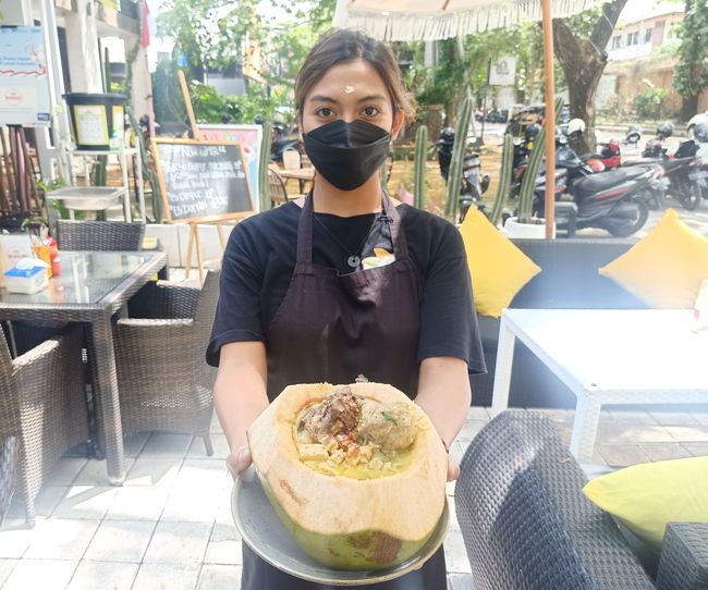 Kelapa muda tak hanya menjadi minuman pelepas dahaga. Bakso Mukbang di Denpasar, Bali, justru menawarkan sensasi menikmati bakso sekaligus kelapa muda secara bersamaan. Menu ini bernama Bakso Kelapa Sapi Super Komplit. Jeg jaen, Ton (semeton)!