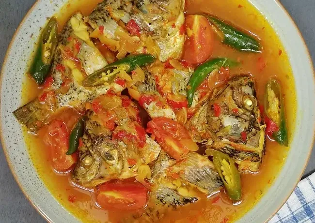 Kuahnya yang berwarna kuning cerah sangat menggugah selera, dengan warna kuning kuah yang berpadu dengan hijau daun kemangi dan merah cabai rawit, menciptakan tampilan yang segar. Asam Jawa dalam kuah memberikan rasa asam yang menyegarkan, menambah kelezatan hidangan ini secara keseluruhan.