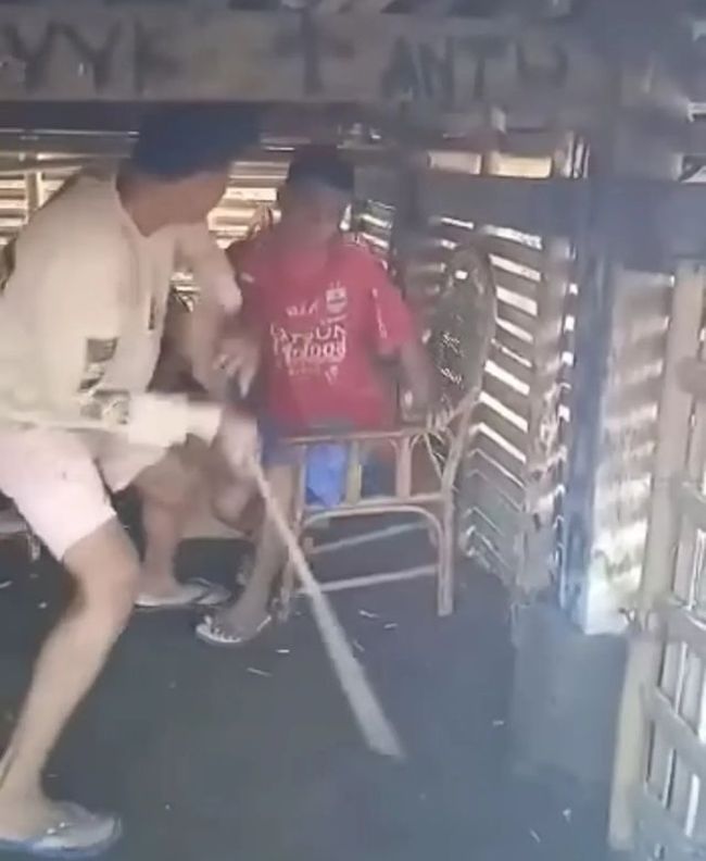 Dalam video itu, terduga pelaku memukuli korban dengan menggunakan kayu batangan di sebuah kolong rumah panggung, korban yang dipukul sedang duduk di kursi.