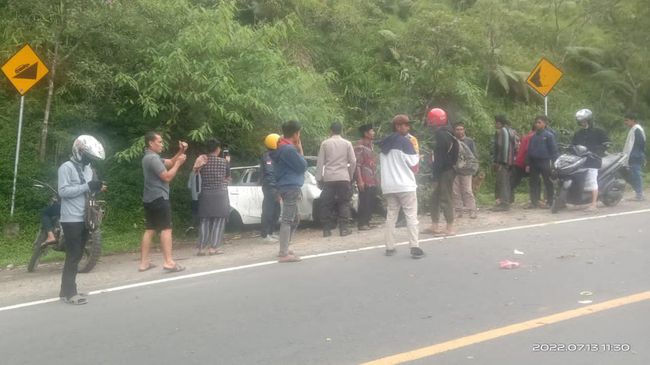 Mobil Datsun Go yang mengangkut delapan orang penumpang beserta sopirnya terjun ke jurang di Jalan Raya Pusuk Sembalun, Lombok Timur, Rabu (13/7/2022). Polisi mengungkap detik-detik terjadinya kecelakaan yang menyebabkan tiga orang tewas tersebut.