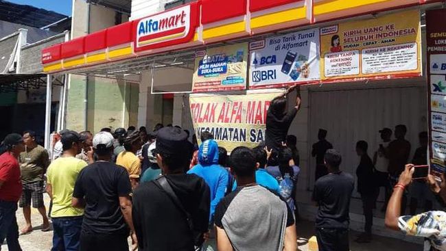 Massa menyegel dan menutup paksa Alfamart di wilayah Desa Naru, Kecamatan Sape, tepatnya di samping SMAN 1 Sape. Akibatnya, karyawan yang bekerja harus pulang.