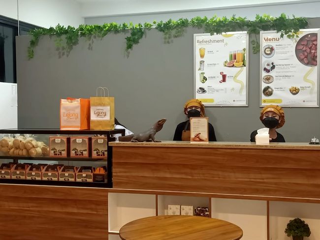 Toko Kompiang Lejong menyediakan sejumlah meja dan kursi sehingga wisatawan bisa langsung mencoba Kompiang di sana. Tersedia kopi Flores untuk dinikmati bersama Kompiang di sana, maupun dibawa pulang untuk oleh-oleh bagi keluarga maupun sahabat.