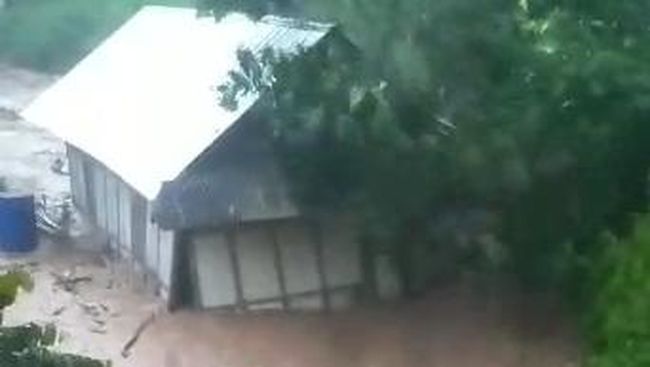 Dalam video yang beredar, tampak rumah hanyut terbawa banjir. Rumah itu amblas, tak kuasa menahan derasnya air yang mengaliri sisi sungai.