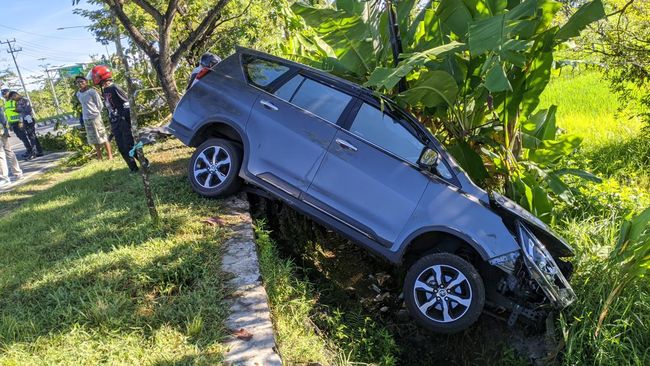 Sebuah mobil Toyota Innova Reborn nyungsep atau terperosok di Jalan Bypass BIL I, arah Bandara Internasional Lombok, Lombok Tengah, Nusa Tenggara Barat (NTB), Rabu (26/4/2023). Mobil tersebut terperosok ke parit atau selokan, memasuki wilayah Desa Sukarara, Kecamatan Jonggat.