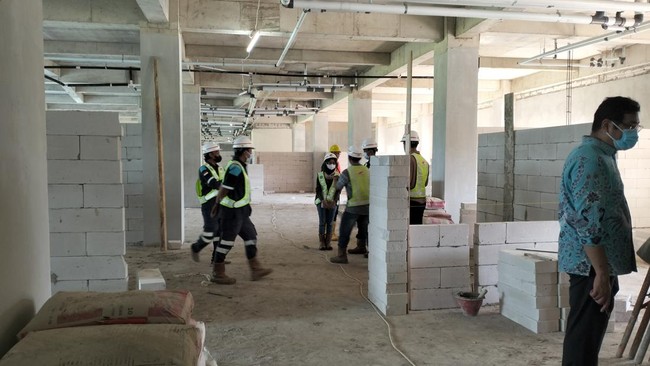 Pantauan saat Budi Gunadi meninjau RS tersebut, Minggu (30/4/2023), ruang-ruang perawatan di lantai tiga RS tersebut sedang dikerjakan. Terlihat sejumlah pekerja menyusun bata. Ada yang sedang mencampur semen dan pasir untuk pengerjaan bagian lantai ruangan.