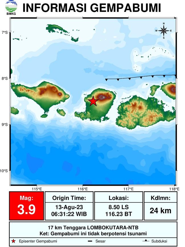 Kepala Stasiun Geofisika BMKG Mataram Ardhianto Septiadhi mengatakan gempa dengan M 3,9 itu terjadi pada 8.50 Lintang Selatan (LS) dan 116.23 Bujur Timur (BT). Gempa berpusat di daratan pada jarak 17 kilometer (km) Tenggara Lombok Utara NTB. "Gempa berada pada kedalaman 24 kilometer," kata Ardhi saat dikonfirmasi detikBali, Sabtu.