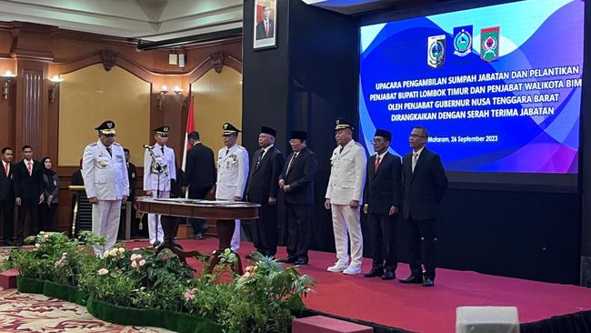 Penjabat (Pj) Gubernur Nusa Tenggara Barat (NTB) Lalu Gita Ariadi melantik Pj Bupati Lombok Timur Juaini Taofik dan Pj Wali Kota Bima Muhammad Rum. Pelantikan dihelat di Lombok Raya Hotel, Mataram, pada Selasa (26/9/2023).