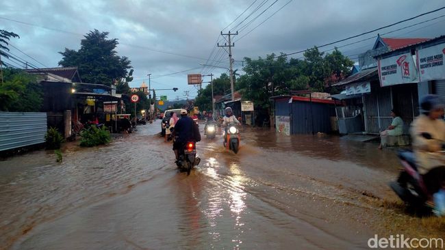 Hujan deras mulai turun sejak pukul 13.00 Wita membuat air Sungai Laju meluap ke pemukiman warga dan menggenangi rumah serta meluber ke jalan raya.