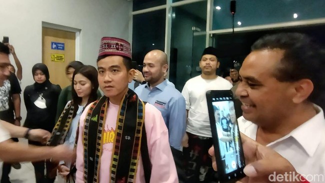 Gibran tiba di Labuan Bajo pada Sabtu dinihari (30/12/2023). Gibran yang memakai sweater merah muda itu turut ditemani istrinya, Selvi Ananda. Gibran dan Selvi dikalungkan selendang songke khas Manggarai Barat saat tiba di Bandara Komodo Labuan Bajo pada pukul 00.10 Wita.