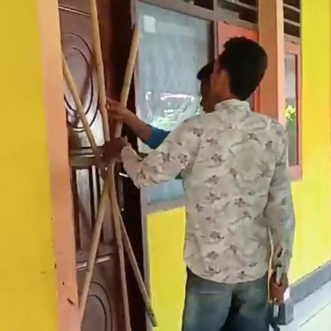 Beredar video sejumlah pria menyegel salah satu ruangan dengan cara memalang pintu menggunakan beberapa potongan bilah bambu yang dipaku. Video durasi 3 menit 43 detik itu beredar di media sosial Facebook.