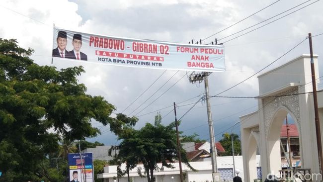 Spanduk pasangan calon presiden dan wakil presiden nomor urut 02 Prabowo Subianto-Gibran Rakabuming satu putaran mulai marak bermunculan di Kota Bima, Nusa Tenggara Barat (NTB).