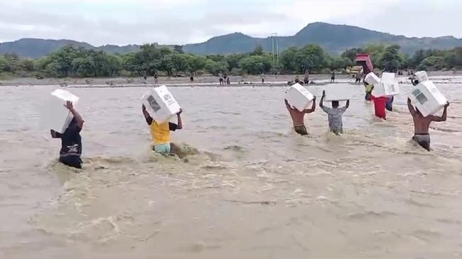 Petugas di Kabupaten Kupang, Nusa Tenggara Timur (NTT), bergotong royong memikul logistik pemilu sembari menerobos banjir. Mereka terpaksa menerobos banjir di Kali Bonpo karena tidak bisa dilalui kendaraan.