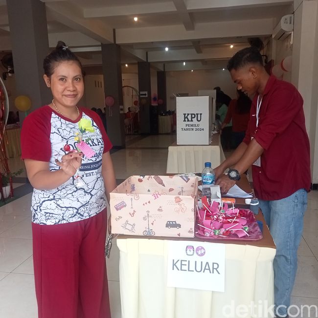 Ada yang unik pada pemungutan suara pemilihan umum (Pemilu 2024) di TPS 004, Kelurahan Pohon Bao, Kecamatan Larantuka, Flores Timur, Nusa Tenggara Timur (NTT). Pemilih diberikan bunga dan permen seusai mencoblos, Rabu (14/2/2024).