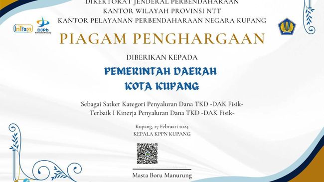 TKD Award Tahun Anggaran 2023 kepada Pemkot Kupang untuk tiga kategori tersebut, di antaranya, peringkat pertama kategori kinerja terbaik penyaluran dana TKD (agregat), peringkat pertama kategori kinerja terbaik penyaluran dana TKD (DAK fisik), dan peningkatan kategori kinerja terbaik pengiriman konfirmasi pajak atas beban BUD.