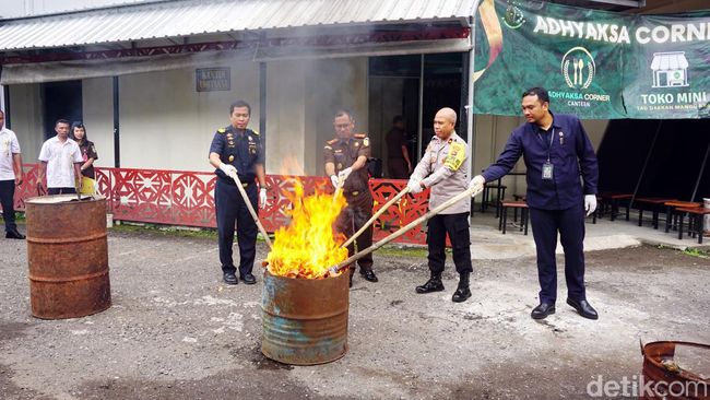 "Pemusnahan barang bukti tersebut dilakukan dengan cara dibakar dalam tong pembakaran, dan pemotongan dengan gerinda bagi barang bukti besi dan senjata tajam sampai tidak dapat dipergunakan kembali," jelas Zaenal.